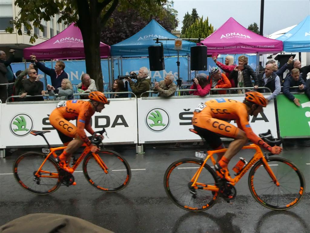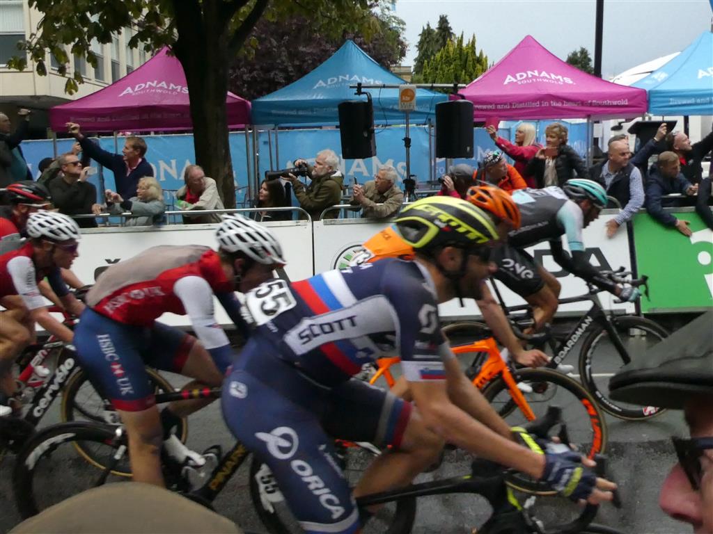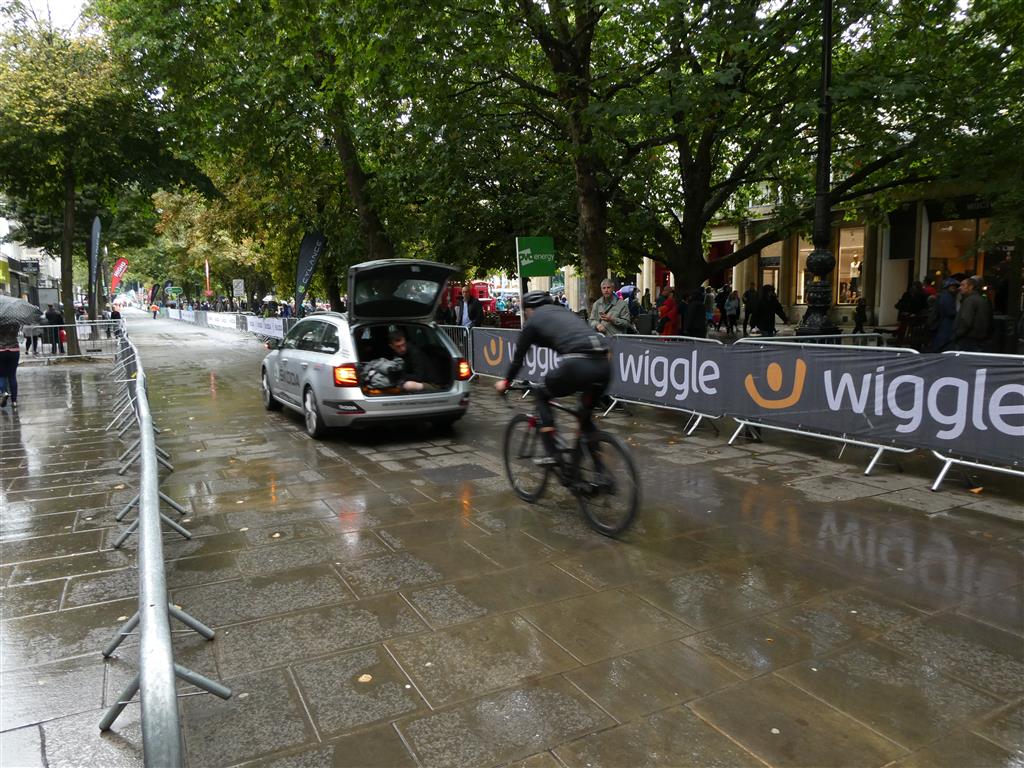 1000’s of people lined the beautiful regency style streets of Cheltenham but in true British Summer weather style, the heavens opened 30 minutes before the race finish with everyone huddling under umbrellas and rivers of watering pouring down the gutters. A new phenomenon, umbrella sharing came into force where we were positioned just a few metres before the finish and we can confirm, It’s certainly a way to meet new friends. The bad weather did not dampen the crowd’s spirits awaiting the race leaders and peloton. What a different experience from the Alps but still very enjoyable.