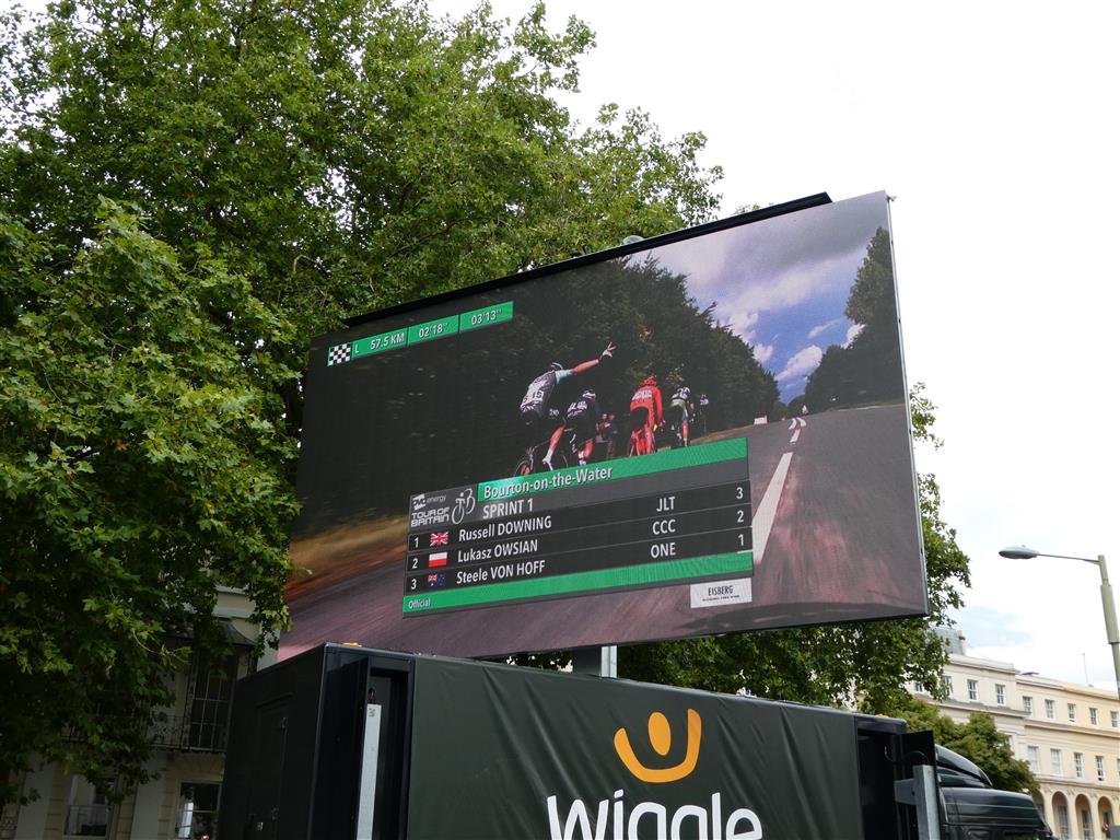 Anticipating crowds and traffic jams we took the double decker bus into Cheltenham. From the top deck we could see storm clouds building up in the distance – not a good sign for the cyclists or indeed us and all of the spectators. Around the finish area thousands of people gathered lining the streets waiting for the cyclists to arrive and finish their epic 115 mile Cotswold race with a sprint finish. The whole area had been transformed with large TV screens and broadcasting units and corporate hospitality. The atmosphere was amazing and very exciting.