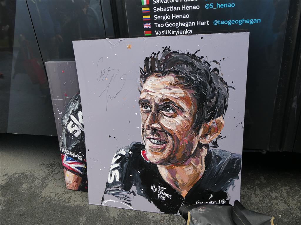 As the crowds dispersed we made our way towards the team cars and buses which had congregated beside the Queens Hotel at the top of the promenade. By this time the rain had stopped and we were very lucky to see Mark Cavendish & Geraint Thomas greeting members of the public. We even managed to spot Mark’s bike which was a real treat.
