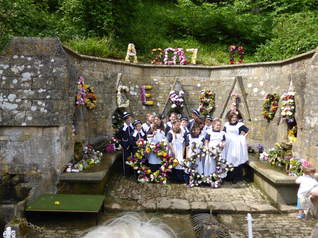 A short Church Service is followed by a Procession to the Wells where wreaths and posies are laid. The eldest 22 children in the Bluecoat village school carry the wreaths and garlands that head the procession and form the centrepiece of the ceremony. These consist of Stars of David, the letters A.D. and the year, letters spelling out the word ‘Ascension’ and five hoops.